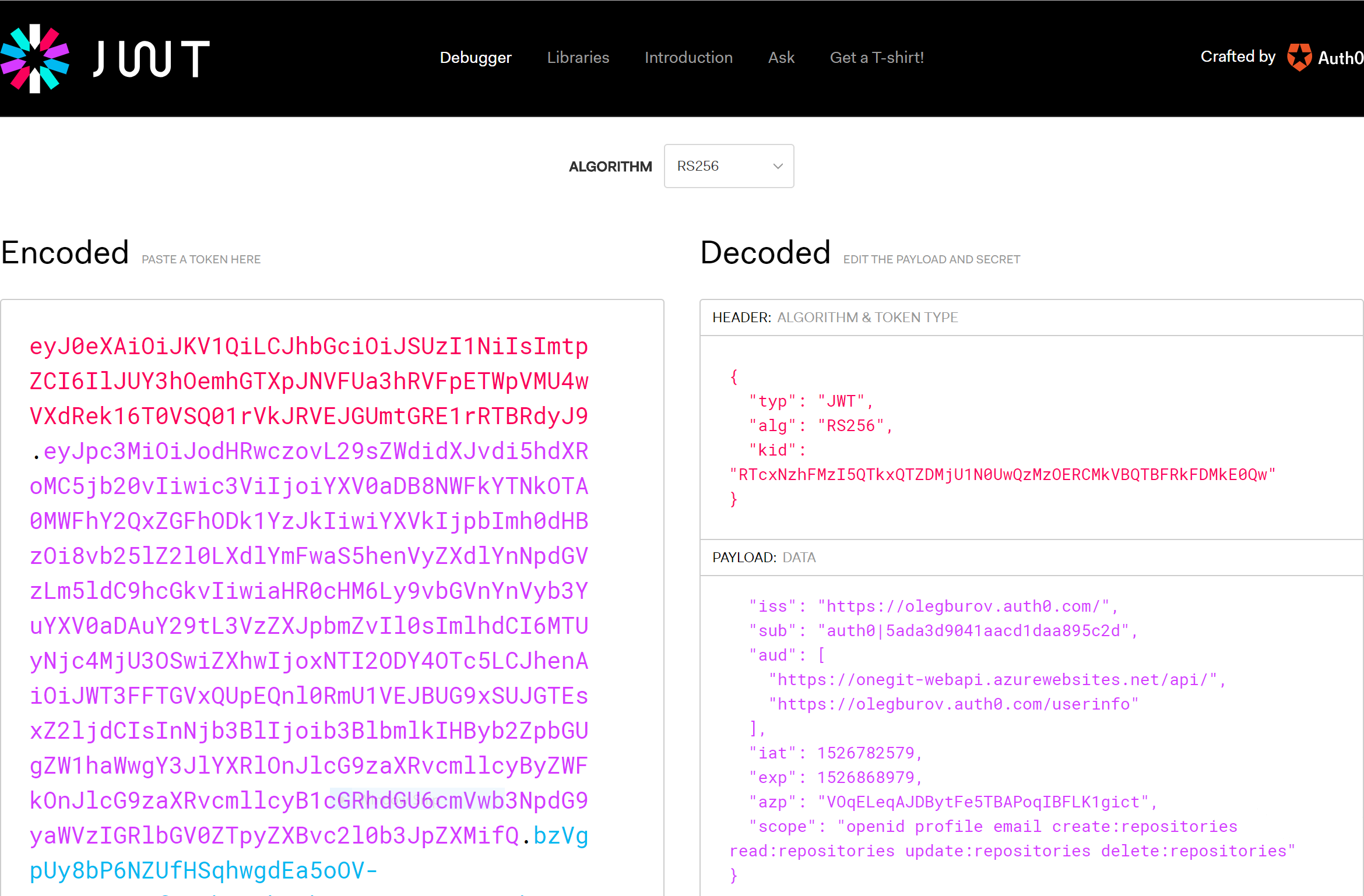The access_token is what you need to use when sending requests to Web API. But let's look inside it first. So, copy its value and past in the field Encoded at the URL https://jwt.io/.